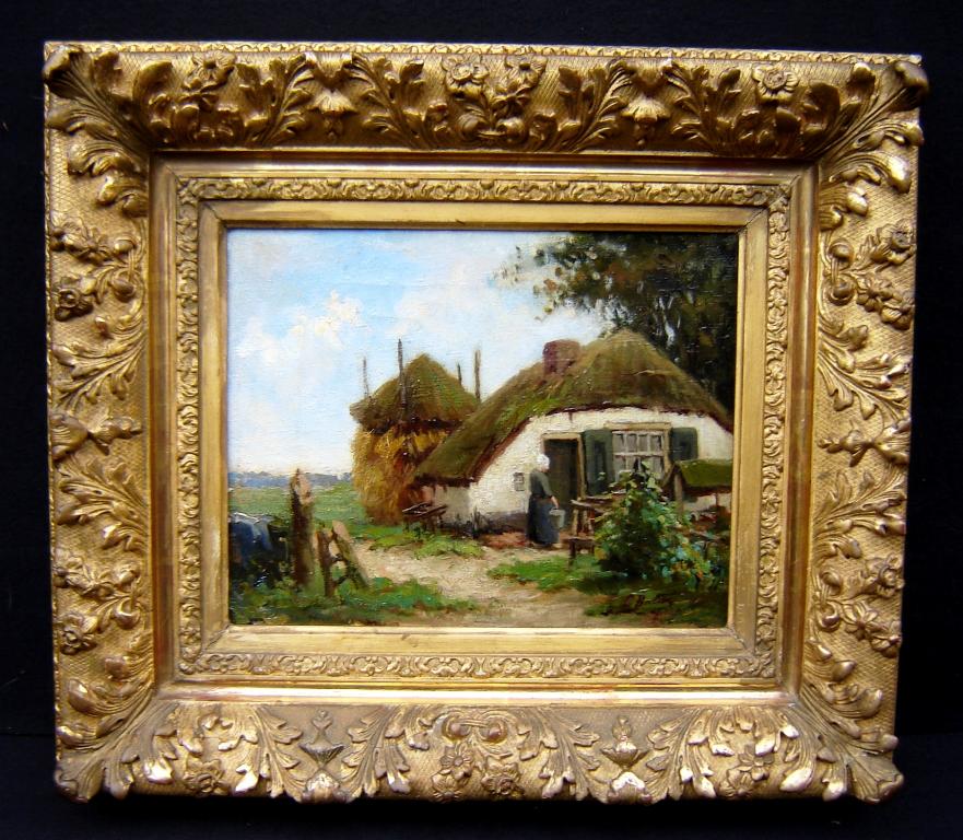 Dit schilderij heeft een leuke voorstelling van een boerin voor haar wit gepleisterde boerderij met daarachter een goed gevulde hooiberg. Het is een tafereel wat waarschijnlijk in de omgeving van Blaricum is geschilderd, gezien het oude etiket op de achterzijde van het spieraam waarop vermeld de titel: “Boerenhofje” en haar naam met tevens de vermelding Blaricum.