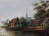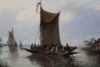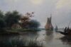 Prachtig schilderij met voorstelling van een volle veerpont die de rivier oversteekt. Op de veerpont vele figuren met ook een boerenwagen met 2 paarden en enkele koeien. Op de achtergrond een zeilboot geladen met hooi. Op de oever boerenhuizen met figuren en op de achtergrond een kerk.