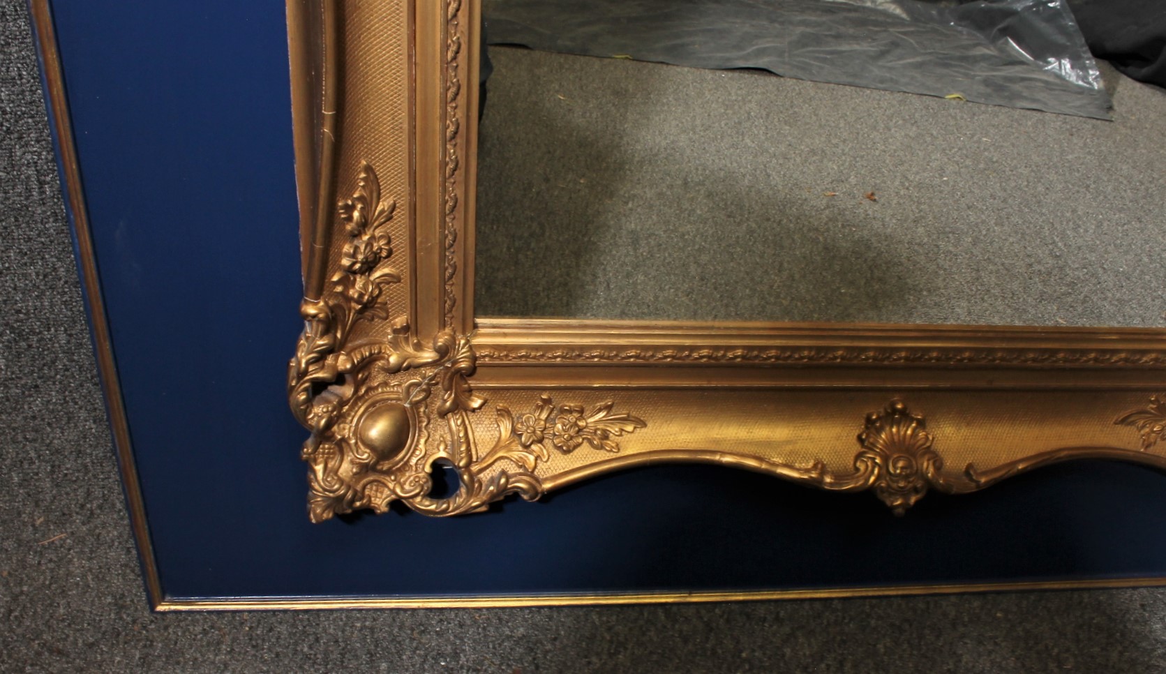 Grote blauwe schouwspiegel met schilderij van Italiaans landschap.
