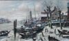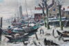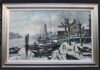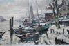 Prachtig groot en uniek olieverf op doek van de Nederlandse schilder Henk Bellaard. Een ijzig winters, en besneeuwd, riviergezicht met afgemeerde tjalken en roeibootjes. Op de achtergrond een kade met enkele huizen. Zelfs wappert de Hollandse vlag nog op een boot in het verschiet.