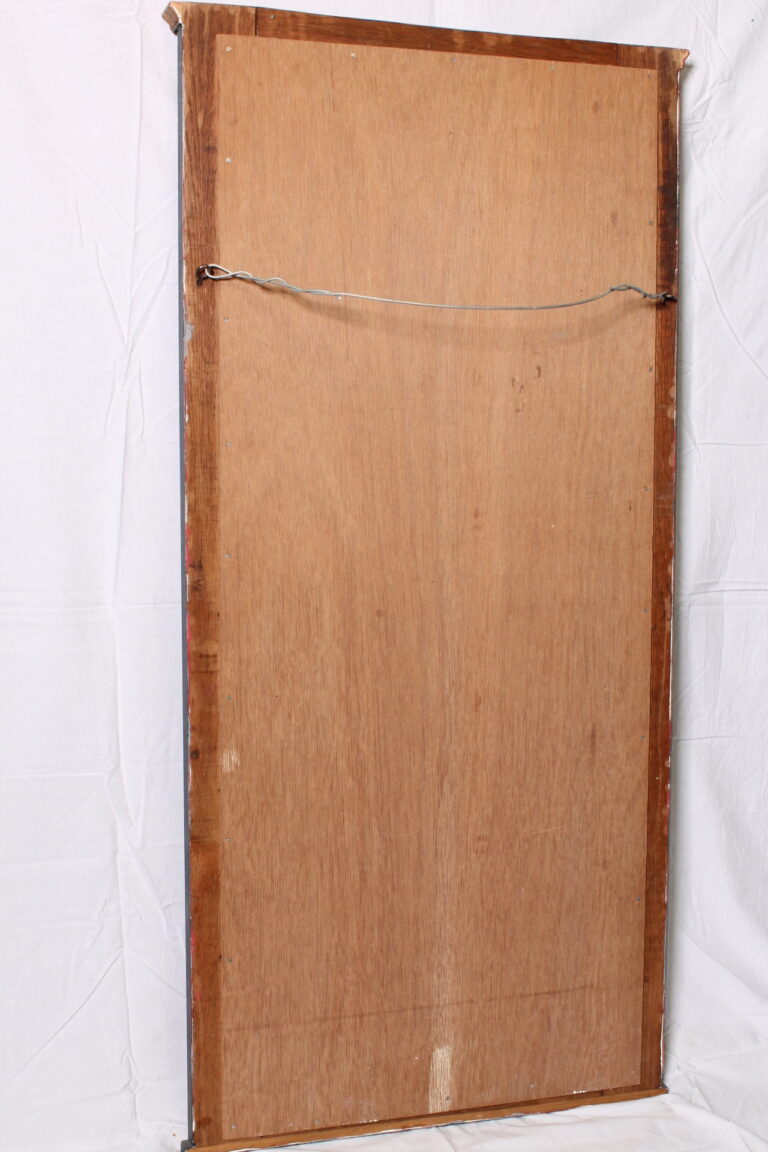 Oude spiegel in een donker blauw gecraqueleerde lijst met schilderij.